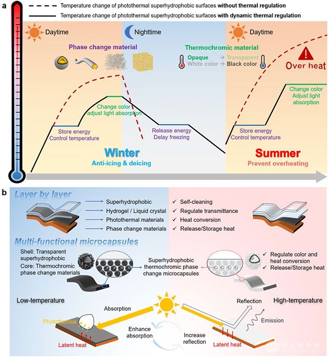 该文明确指出光热超疏水表面过热问题的严重性,并提出了相变材料与热致变色材料协同的动态热调控策略。通过合理的材料设计与结构集成,可实现冬季防冰、夏季防过热的智能响应,推动光热超疏水表面向实际应用迈出关键一步。这一策略为提升光热超疏水材料的实际应用潜力提供了重要方向。