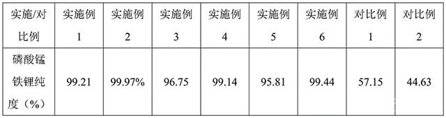 [0045]实施例1~6和对比例1~2中合成的磷酸锰铁锂产物纯度如表1所示: