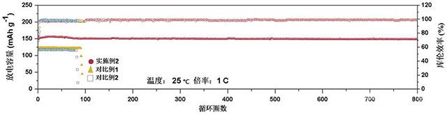 [0023]图2是实施例2、对比例1-2制备磷酸锰铁锂的正极材料长循环性能图。