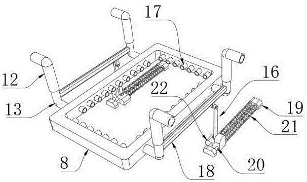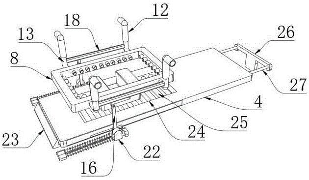 [0021]如图3-图4、图6-图7所示,为了在加热侧管8向下位移时保持工件的不动,在炉膛2底部的一端设置有用于对推板4进行限位的止挡座23,推板4的侧壁设置有驱动腔28,驱动腔28的内侧沿着推板4的长度方向活动连接有滑动架29,滑动架29靠近止挡座23的一端与驱动腔28内腔靠近止挡座23的一端内壁之间设置有第二弹性件31,第二弹性件31优选为弹簧,推臂32固定在滑动架29的侧壁,且在推板4与止挡座23接触之前推臂32不会与滑动座22接触,滑动架29远离止挡座23的一端设置有延伸至推板4外部的驱动杆27,驱动杆27与推板4为活动导向配合,驱动杆27远离滑动架29的一端设置有用于与驱动源3的输出轴螺栓连接的牵引架26,第二弹性件31配置为:在推板4与止挡座23接触之前,当驱动源3通过牵引架26推动推板4位移时,第二弹性件31不会收缩或略微收缩,该部分的设置,可以在工件静止后实现加热侧管8的下移,无需在工件位移过程中进行加热侧管8的下移,因此无需将加热侧管8设置成较大尺寸,且在加热侧管8位于工件侧面外部时还可以控制驱动源3往复带动滑动架29位移,进而推臂32往复推动滑动座22,进而加热侧管8可往复小幅度升降,以此适应工件侧面不同高度的加热。