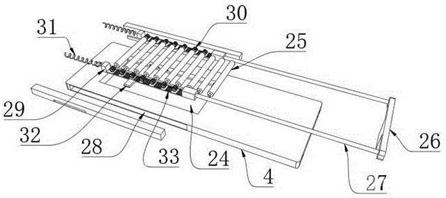 [0022]如7所示,为了在加热侧管8位于工件侧面往复位移时实现工件的小幅度往复位移,在支撑辊25的端部与驱动腔28对应,支撑辊25的端部设置有位于驱动腔28内腔的齿轮30,滑动架29上设置有多个与齿轮30一一对应的齿条33,且初始时齿条33与齿轮30不啮合。
