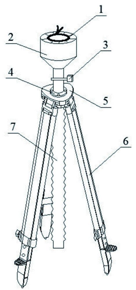 [0021]实施本实用新型所述的露天金属矿穿孔爆破装药装置,使用前,将三角架组件、进料桶2和下料管7进行组装连接,将抽绳式封口袋1套设在进料桶2内,抽绳式封口袋1的底端为开口状;将组装好的本装置置于炮孔上方,可通过调节三角架腿6来适应凹凸不平的场地;由于下料管7为的伸缩波纹管,下料时,伸长三角架组件下部的下料管7至炮孔内,并将混装炸药车的出料管放入三角架组件上方的进料桶2内,通过抽绳式封口袋1系紧出料管,保证在持续装药过程中粉尘不外泄,避免炸药浪费及安全隐患;同时,通过进料桶2下部的流量表3可准确显示炸药的充填量,从而精准控制药量,提高爆破效果;如果装药方式采用的是间隔装药时,在炸药充填量达到设计要求时,可收缩下料管7,使下料管7脱离出料管,以便炮孔内放入其他填充物,需要再次装药时,可通过重复伸长下料管7,实现炸药与填充物的间隔装药作业;作业完成后,将本装置拆下即可携带。